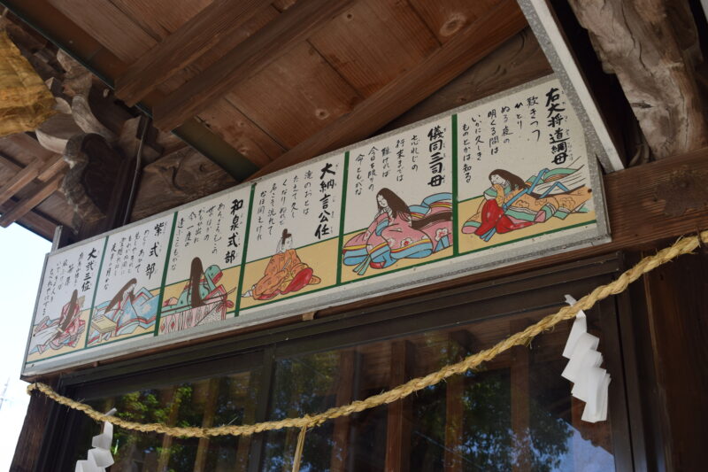 社殿の周囲には、平安の雅(みやび)を感じさせる色鮮やかな歌人絵札が飾られ、文学や和歌の神としての一面を象徴しています。