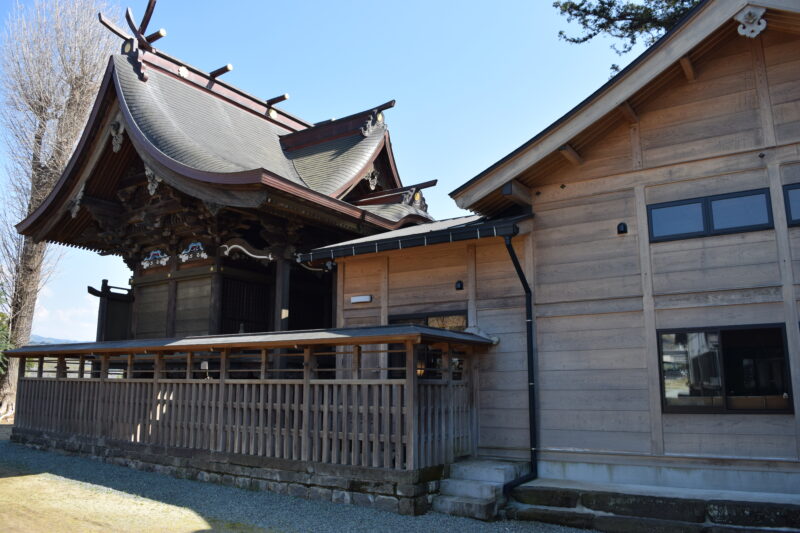 復興再建された拝殿は、妻入り様式の重厚感ある佇まいが印象的です。