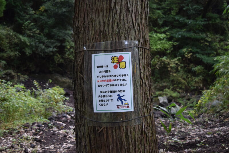 木立に囲まれ、静けさが一気に増すこの場所には、「この下の河原に御神体が鎮座している」と記された案内板があります。