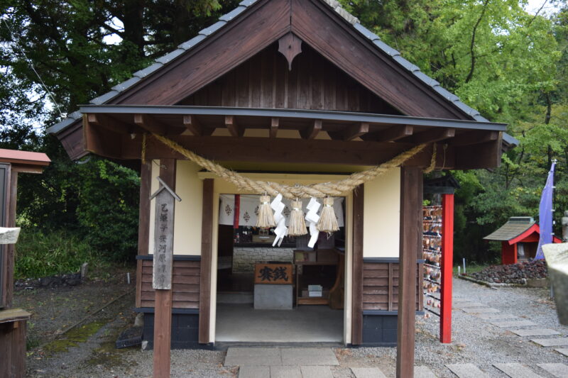 左側には、拝殿や社務スペースにあたる小さな建物が見え、その外側に願いを込めた数多くの絵馬が掛けられた赤い絵馬掛けが並んでいます。