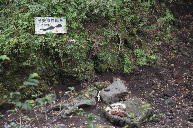 木々に囲まれた岩場の中央には「子安河原観音 御神体」と書かれた看板が掛けられ、ここが信仰の核心であることを示しています。