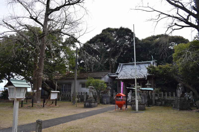 島内に入り、若宮海水浴場方面へ向かって進むと、緑豊かな木々に囲まれた道の中に神社の入り口が見えてきます。