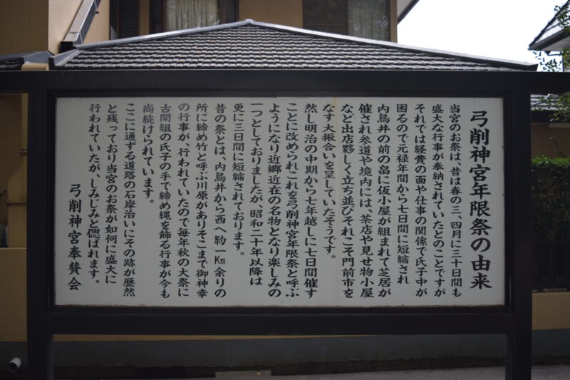 奉納所の前に置かれた弓削神宮の案内板で、夫婦和合や子宝祈願にまつわる由来が記されています。